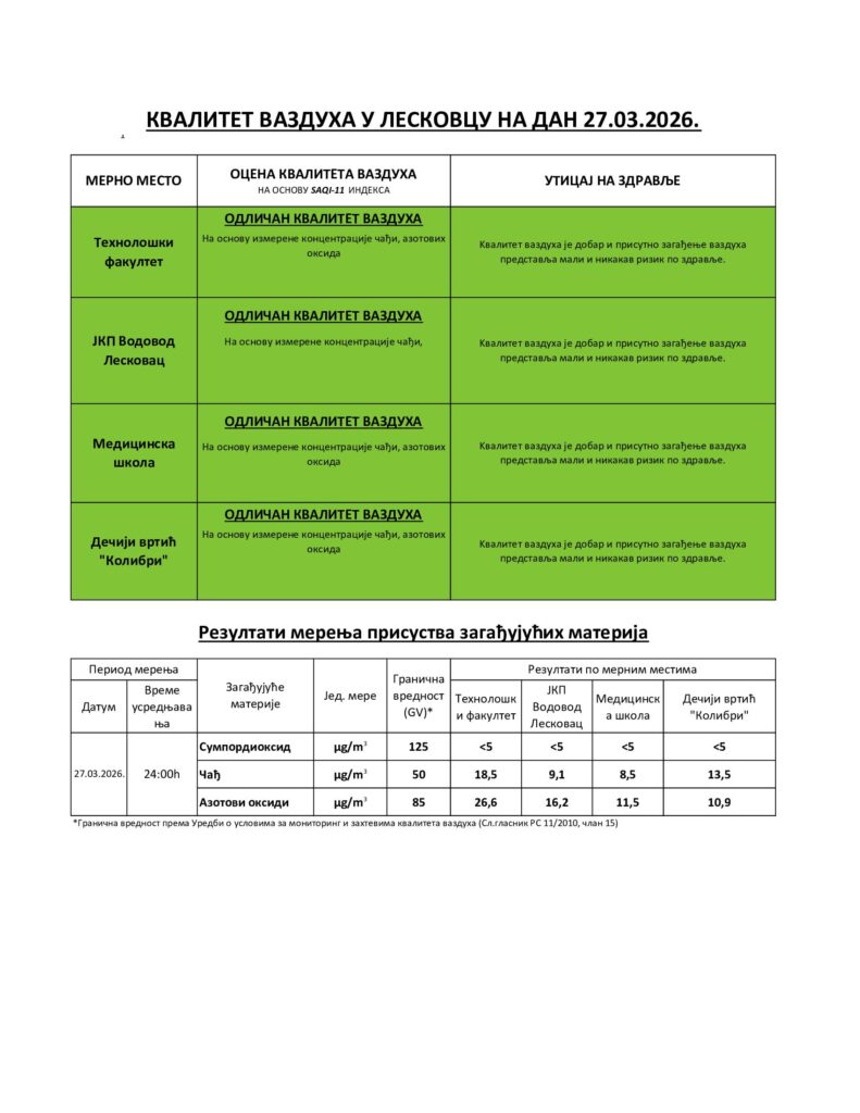 КВАЛИТЕТ ВАЗДУХА У ЛЕСКОВЦУ НА ДАН 27.03.2026. ГОД.